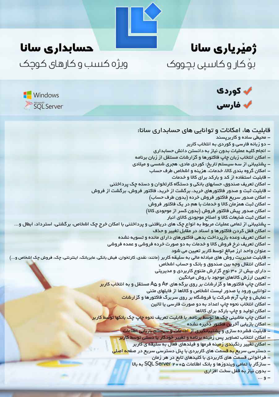 نرمافزار حسابدرای سانا، برنامهای مناسب برای حسابداری کسب و کارهای کوچک با قابلیت پشتیبانی از دو زبان فارسی و کوردی و مهمتر از هرچیزی برای کار با این نرمافزار نیازی به دانش حسابداری نخواهید داشت.